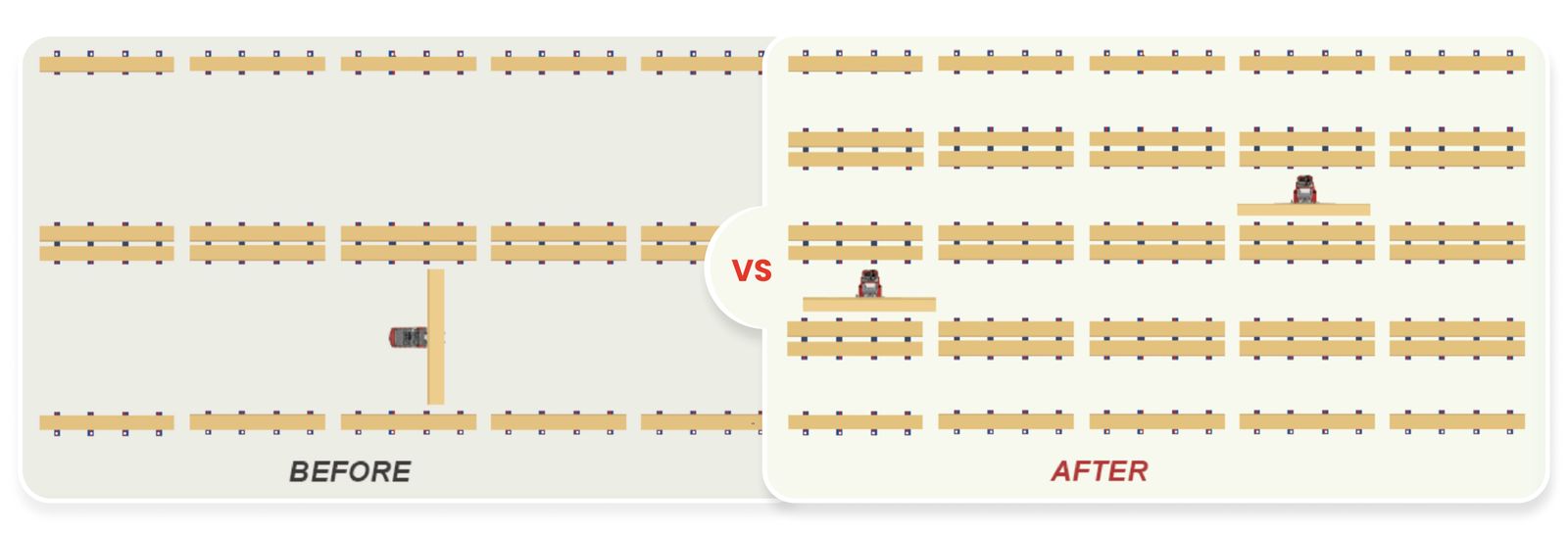 Compared to conventional counterbalance forklifts for long material stacking, multi-directional and omnidirectional forklifts can double storage rack height and reduce aisle width by 55% within the same warehouse space. This ultimately increases overall storage capacity by 150%.