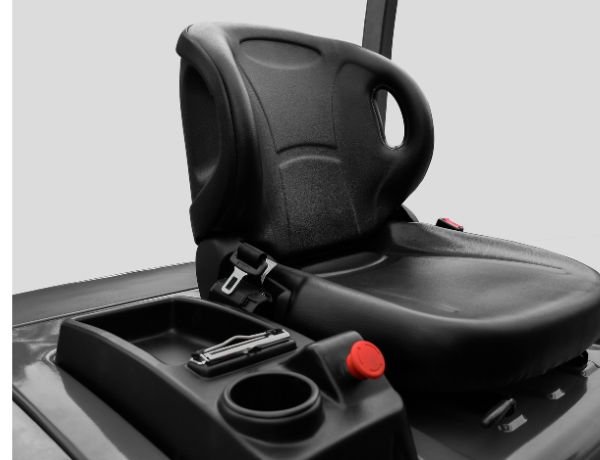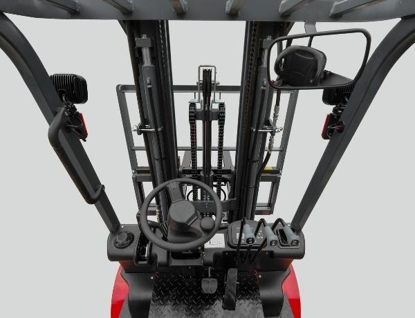 - The cab is ergonomically designed with adjustable steering wheel tilt and seat position.