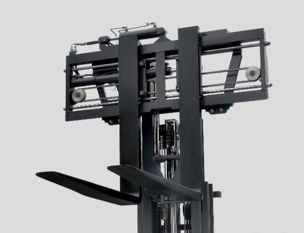 It requires narrow aisles for both sideways and straight traveling, making it ideal for stacking long materials in tight spaces. Compared to standard counterbalanced forklifts, it significantly reduces the right-angle stacking aisle width, offering excellent overall performance.